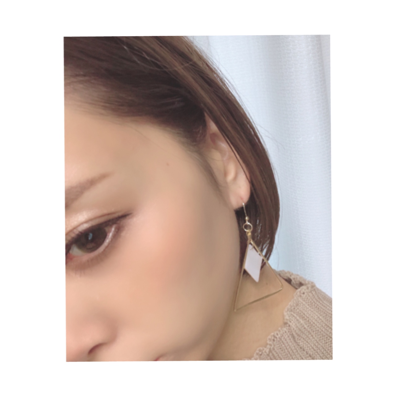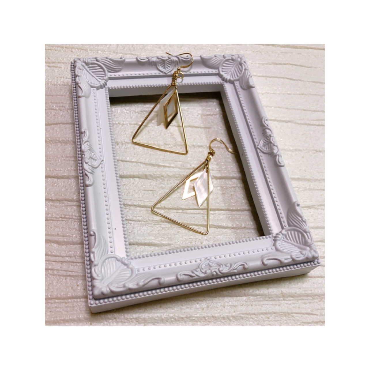 ゴールドの三角ベースに三角のホワイトとゴールドのユラユラ揺れる、可愛いピアスです。