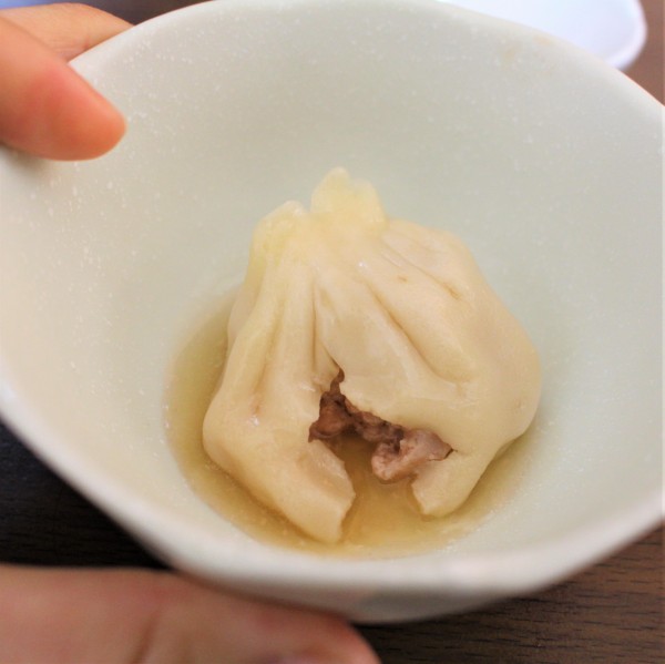 そして、皮を1口食べると、肉汁がたっぷりと溢れ出してきました。