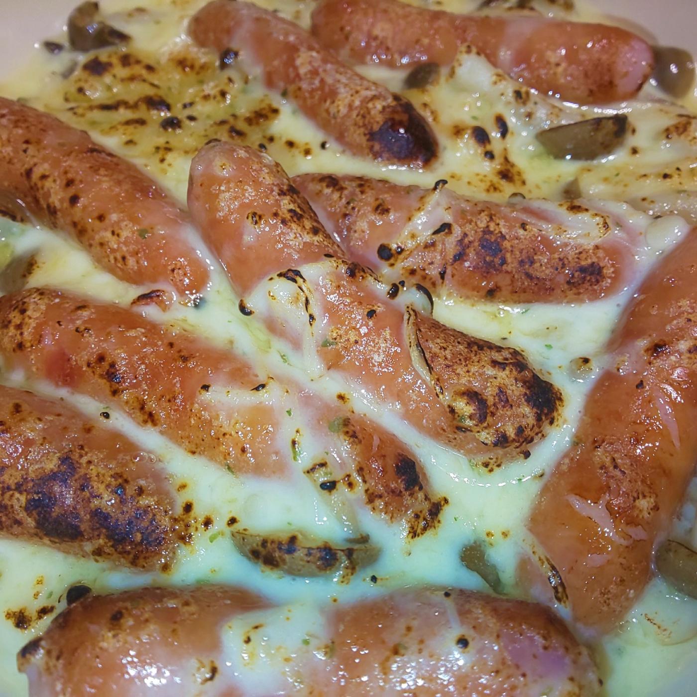 次に、キノコとババリアウインナー、チーズを炒め、塩で味付けし。。