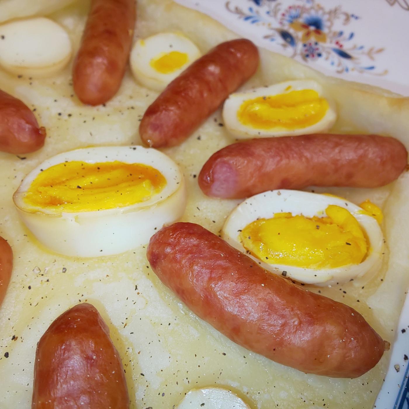 冷凍パイシートに、ババリアウインナーと今回はゆで卵をスライスして乗せ、焼きました