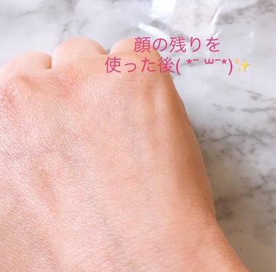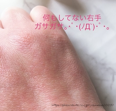 最初手に残った分を左手だけつけていて、右手はあえてつけなかったのでガサガサです(2枚目の写真)。あまりにも左右差が出てしまったので3枚目の写真は右手にもつけてみました。(後に使う再凛生も使ってます)乾燥って怖いですね。。手が一気におばぁちゃんです。顔と手は違うとはいえ、乾燥によるシワが大きく見た目を変えてしまうといった点では一緒ですよね。