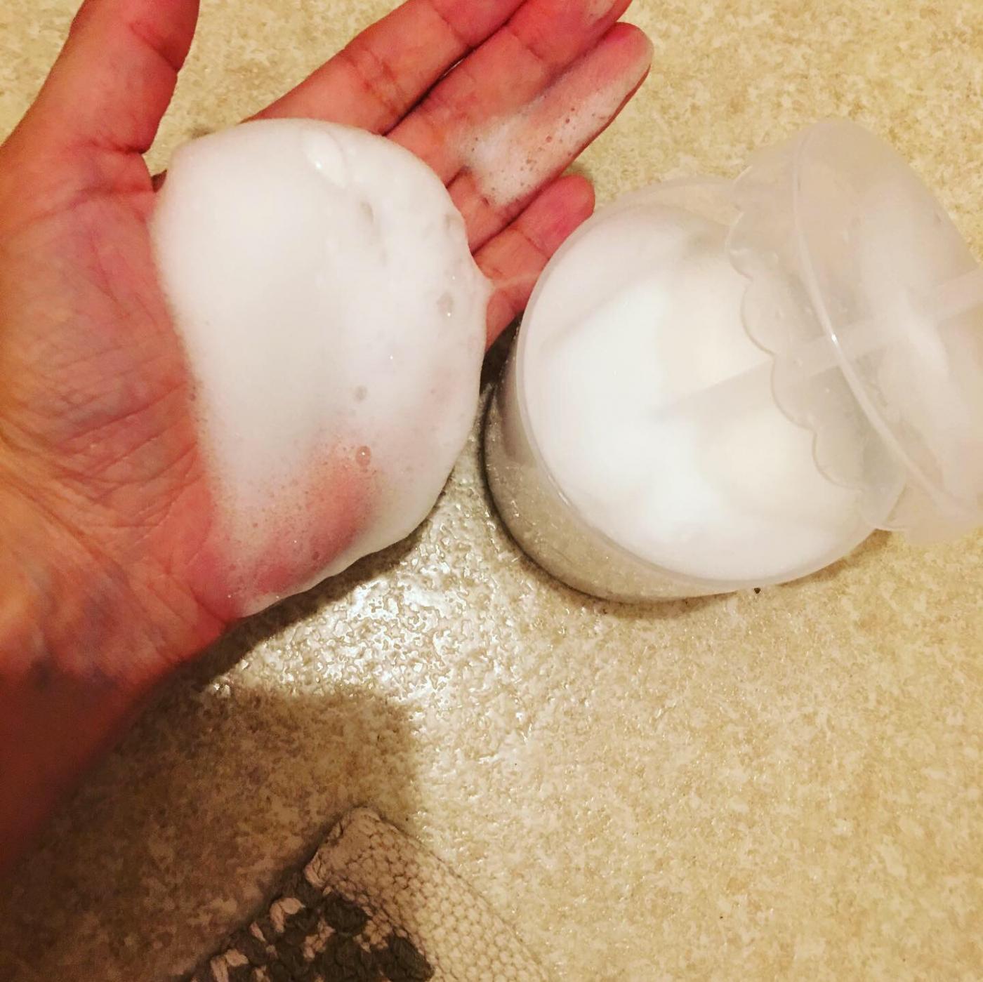 小さじ1杯分ぐらいの粉を専用の容器に入れて、水を少し入れて、付属の泡だて器で泡立てるとすぐにもっちり泡が作れました。この容器での泡だでが、楽しく子供が泡だててくれました。顔からデコルテにかけてこの泡で洗顔したのですが、それだけで肌がワントーン明るくなったのがすぐにわかりました。これにはびっくりしました!その後、ローションをつけたのですが、このローションがクリームのようなものなのでそれにもまたびっくり!クリームローション?なんて初めてです。そして、その後の美容液でデコルテから肩までつけれました。この3ステップだけで本当に肌が明るくなったので、続けて行く事で本当に美白効果がアップするのではないかと思ってとても期待しています。今後の美白がどこまで白くなれるかが楽しみです♫夏の紫外線で出来たシミ予備軍を全部退治して欲しいです。