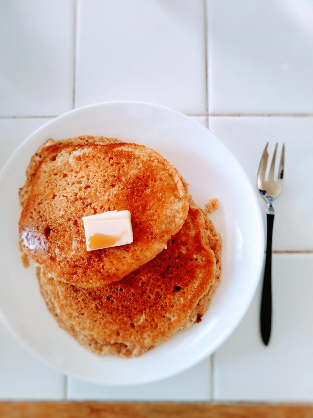 粉の美味しさをダイレクトに感じたいと思い、最初は桜島ふれんずの全粒粉を多めに使ったアップルパイを作りました。いつも作るアップルパイも全粒粉を使ったレシピなので同じように作ったのですが、桜島ふれんずの全粒粉は挽きたてだからか、水を加える前からかなりしっとりまとまり、水分量を大幅に減らしました。焼き上がりは水分量を減らしため生地はかなりホロホロで見た目的にはあまり綺麗には出来ませんでしたが、とても美味しい生地に焼き上がりました。元々全粒粉の味が好きなのですが、桜島ふれんずの全粒粉はいままで食べた全粒粉の中でも特に香ばしく、少しきな粉や、ごまのような風味も感じました。残った粉でパンを作ろうかと思っていたのですが、まだパン焼き初心者なので水分量の調整が難しそうでパンケーキに変更しました。でもとても美味しい粉なので、もっと上手くパンを焼けるようになって、また桜島ふれんずの全粒粉を使って是非美味しいパンを焼いてみたいです。