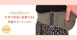 片手で容易に装着できる骨盤サポートベルト片手で容易に装着できる骨盤サポートベルト片手で容易に装着できる骨盤サポートベルトとは 片麻痺のお客様が自分では装着できないことを指摘され、考えて作ったのが「片手で容易に装着できる骨盤サポートベルト」です。 ポイントは、ウエスト部分に仮止めが出来る事で用を足しに行ったときにウエスト部分にずらし上げることによっていちいち外さなくてもよい事です。 更に、介護や看護等で急に力仕事がある時に、ウエストスタンバイですぐにずらして装着することも出来ます。 装着方法 ① 右端のマジックテープの部分を反対側の金具に通して仮止め用マジックテープに取り付けてウエスト部分に仮止めする。 ② その後骨盤の前のグリグリと太ももの横のグリグリの間にずらす。 ➂ 定位置にずらし終わったら、装着用マジックテープを本止め用マジックテープへ引っ張って止める。 ④ この商品は下着の上に装着しても大丈夫ですが、お召し物の上からでも装着できるように、色合いも新色「ブラックグレー」をご提供しております。 従来製品の「いかにも生ゴムベルト」という色ではございません。 最後に 体のゆがみは心のゆがみこの言葉は整体師として、いつも思っていることです。 身体のどこかが、ゆがんでいると痛みやつらさで心も憂鬱になりますよね? この骨盤サポートベルトは、不慮の病気や生活習慣などで、慢性的に起きている痛みやつらさを改善する役に立てればと製品化をするのに、約3年間掛かりました。 そしてやっと皆様に応援して頂けるような製品になったと思います。 この機会に是非ご体験ください! / 0件のレビュー この商品の購入はコチラ