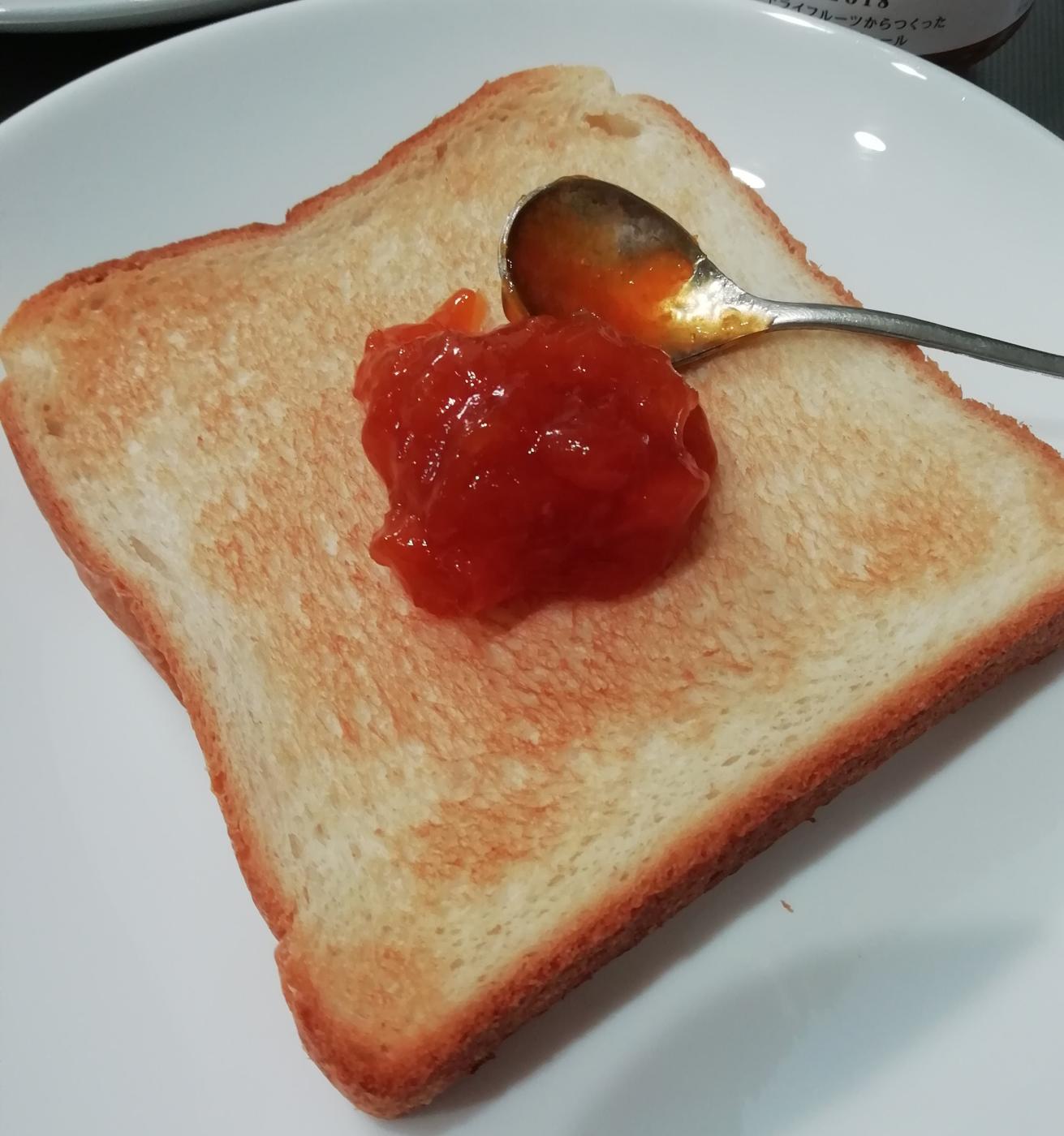 まずは、ドライフルーツからつくったコンフィチュール〔アプリコット〕を軽くトーストしたパンにたっぷりのせて食べました