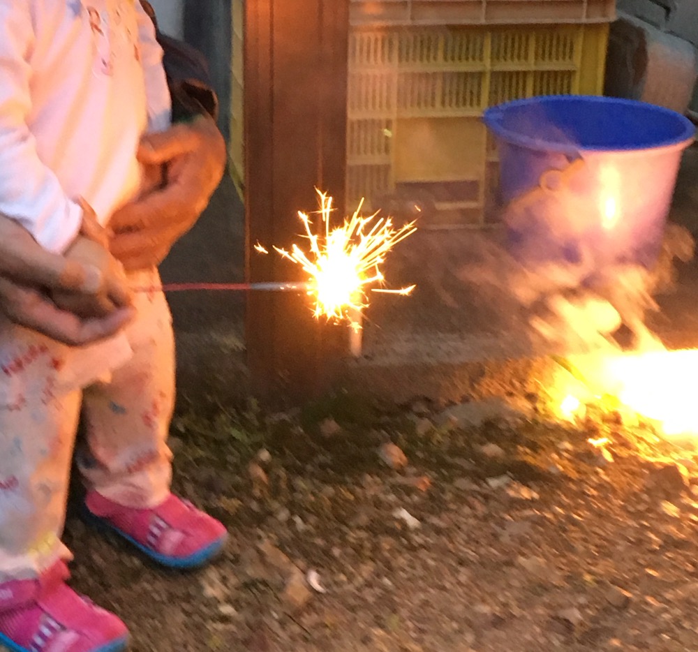 1歳の妹ちゃんも、初めて自分で花火を持って遊ぶことができて、パチパチキラキラする花火に興味津々でずっとはしゃいでいました。