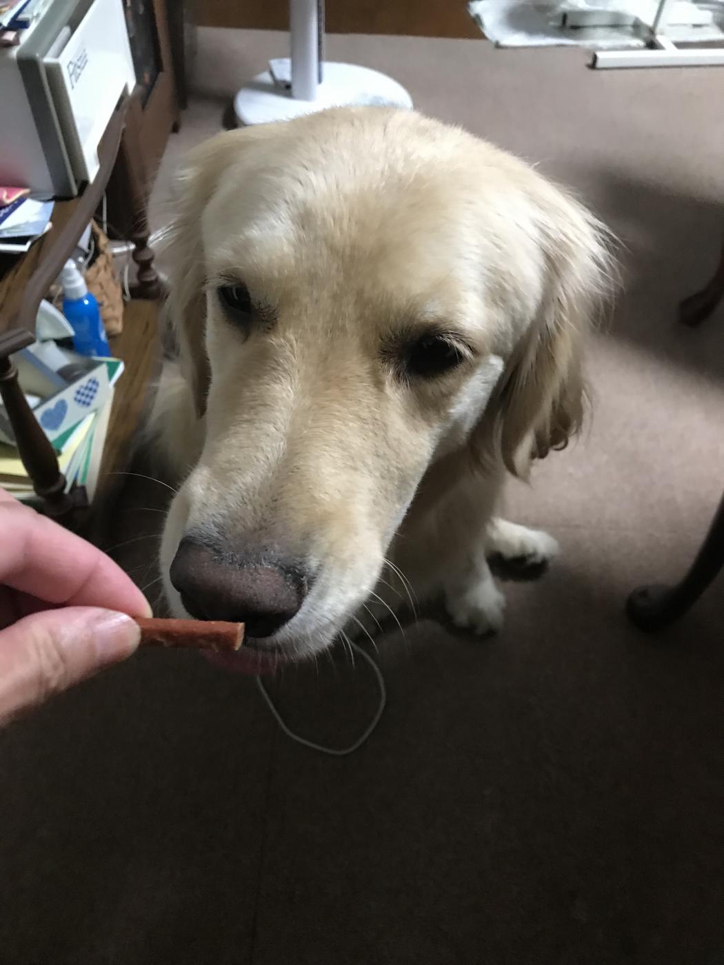 香ばしい匂いをすぐに嗅ぎ付けたようです。「マテ」の指示に「そんなに待たせないで~」と目で応えてました。食べやすい大きさで大型犬(ゴールデンレトリバー)のうちの子だと一口でパクリ!ですが、小さくちぎりやすい形状で、1本と2つに分けてしつけのご褒美としてもあげやすいです。