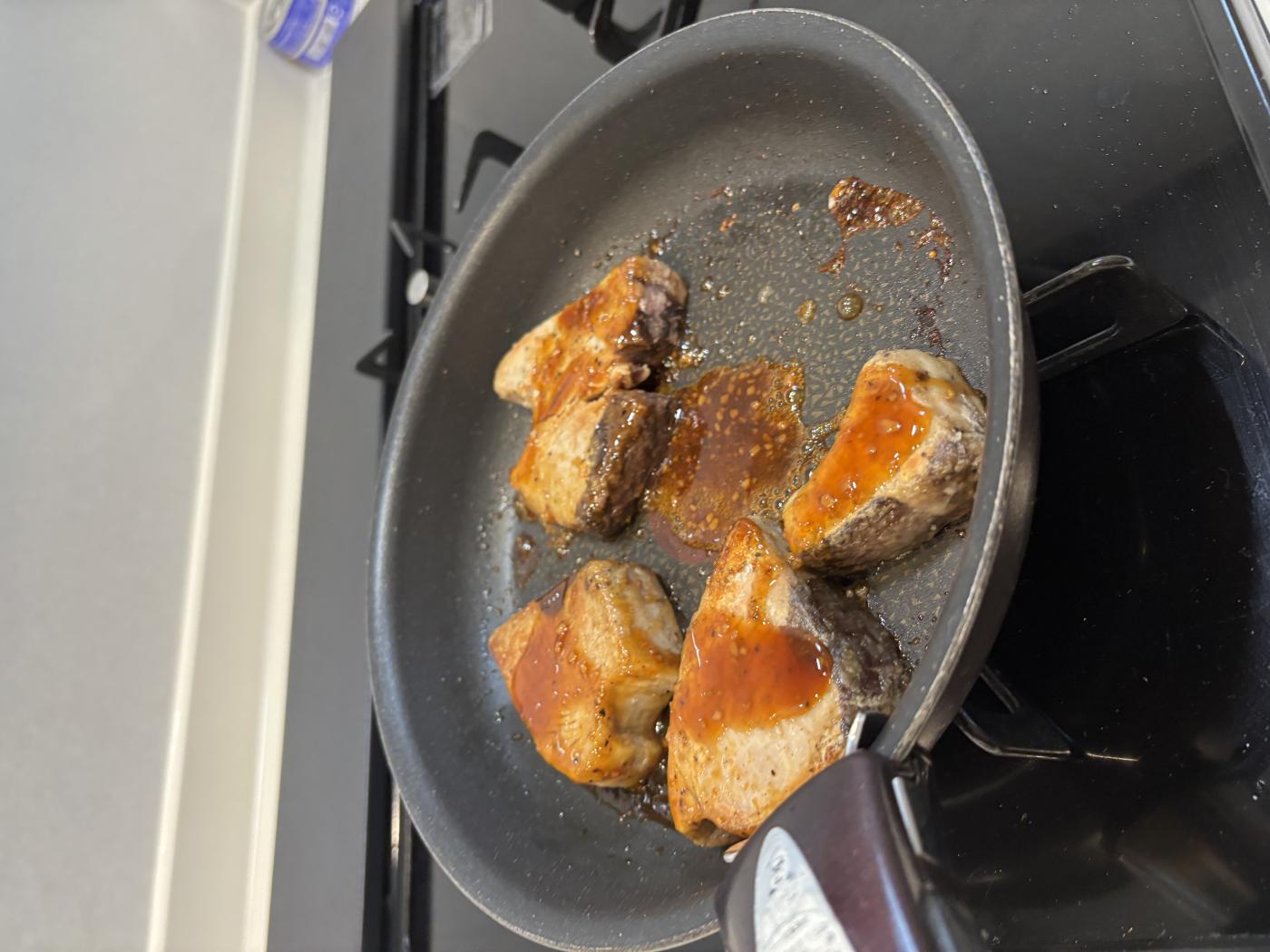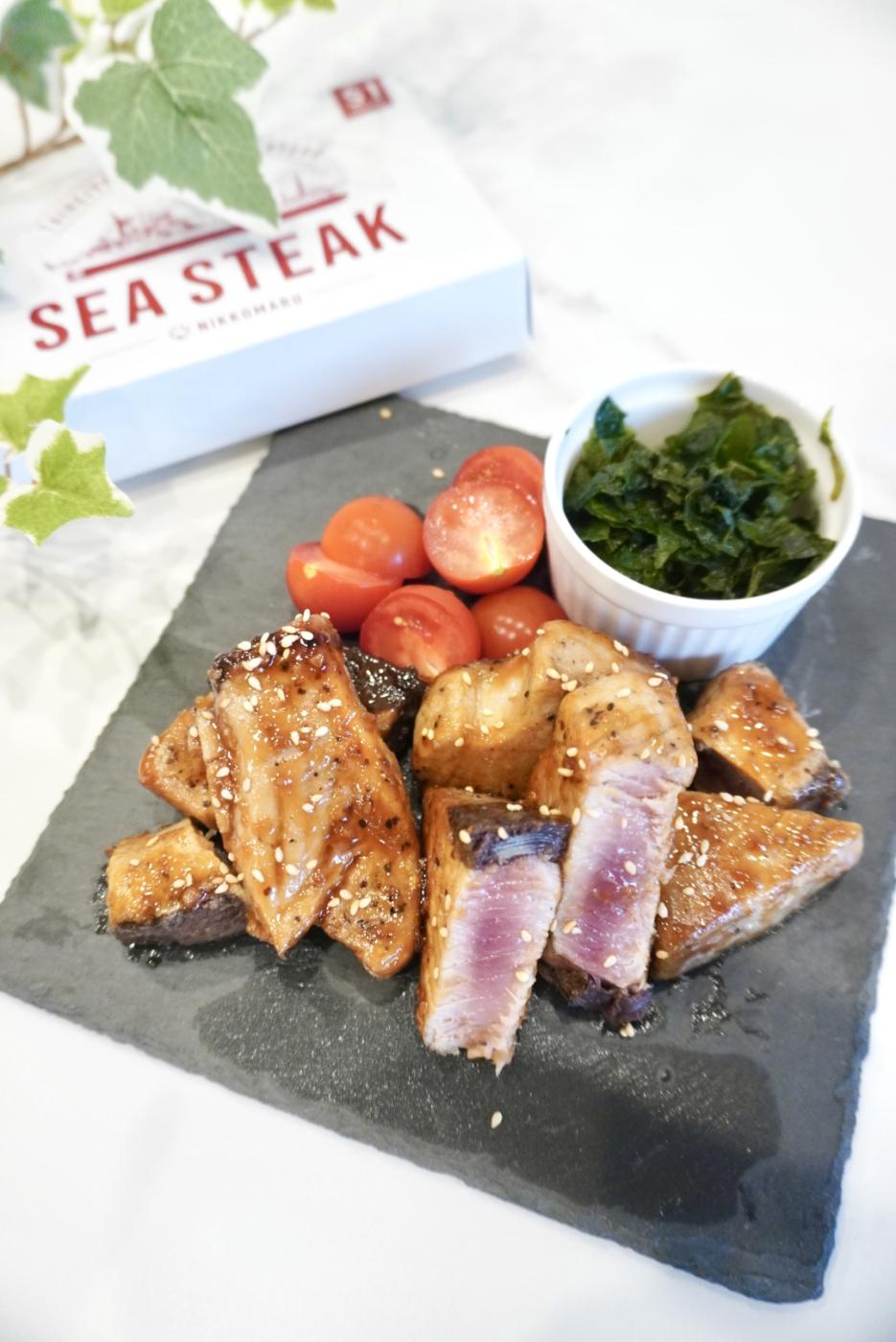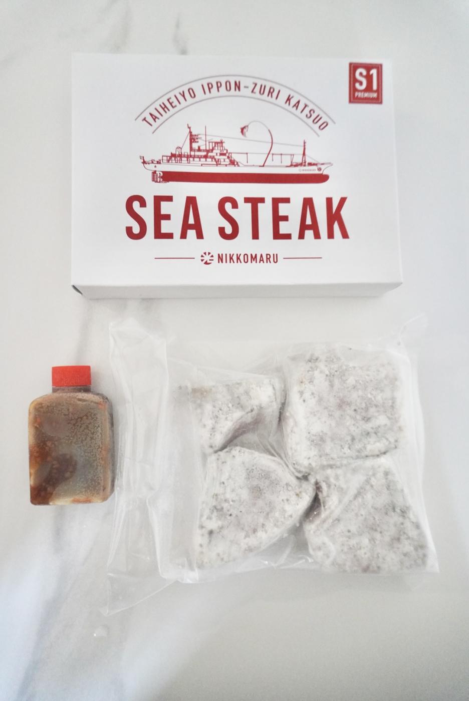 冷凍された状態で届くカツオのステーキ。ソースもセットで付いていて、片栗粉もまぶされた状態で届くので味付け不要で簡単に調理ができます。早速フライパンで両面3分ずつ焼いて、お皿へ盛り付け。食べやすいようにカットすると綺麗で鮮やかな鰹の赤色が!食べてみると肉厚でふっくら柔らかな鰹と、程よく濃いめのガーリックソースの相性がたまらなく美味しい。鰹特有の生臭さも感じられないので、苦手な人でも食べられると思います。付け合せで冷蔵庫にあった紫蘇とトマトも添えて一緒に食べると、爽やかな味わいになってこれもまた絶品でした。ソースが美味しいので丼にしても良さそう。