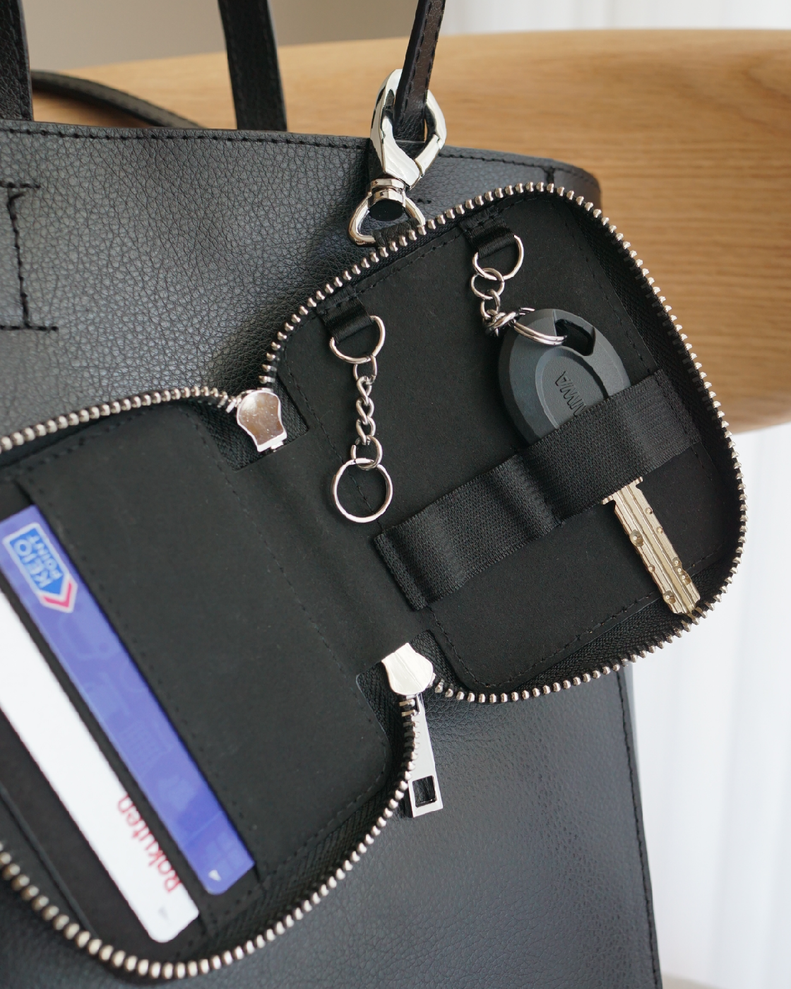 嵩張るICタグ付きの鍵を余裕で入れることが出来るし、キーチェーン付きなのでカバンに付けたママで鍵を開けることが出来るので「メインエントランスや玄関前で鍵を探す」という行為が無くなって快適生活☻