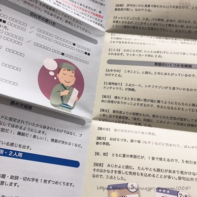 分かりやすい説明書も付いてるから初めてでも大丈夫。春夏の季語カードはそんなに難しい言葉は無くフリガナもふってあります。子どもがもしわからなくても、教えてあげられるレベルだと思います。「七福神詣り」や「風花」などちょっと難しい季語は説明書に意味が書いてあります。まずは説明書を読みながら一人で遊んでみました。