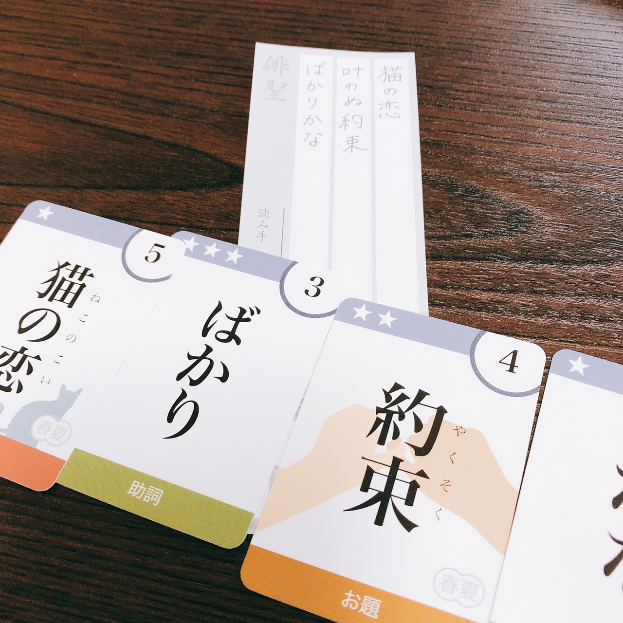 初心者は、最初からすべてルールブック通りに遊ぶ、というよりは、まずは基本的な俳句の作り方に慣れるためのお題カードとして使った方が楽かもしれません。