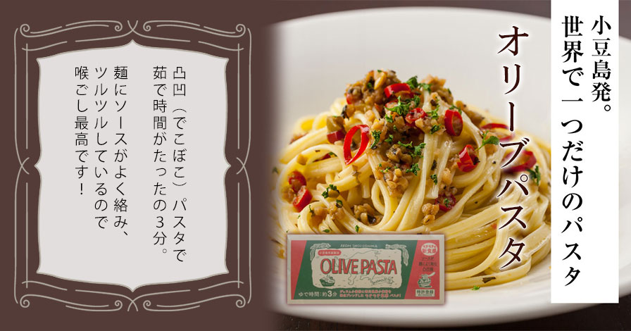 オリーブパスタオリーブパスタ世界でたった1つのパスタ。 凸凹(でこぼこ)パスタで、茹で時間がたったの3分。 小麦粉はデュラム小麦粉に香川県産小麦粉を独自ブレンドしました。 さらに質の高いオリーブオイルを練りこみ、モチモチ食感に。 麺にソースがよく絡み、ツルツルしているので、喉ごし最高です!5.00 / 3件のレビュー この商品の購入はコチラ