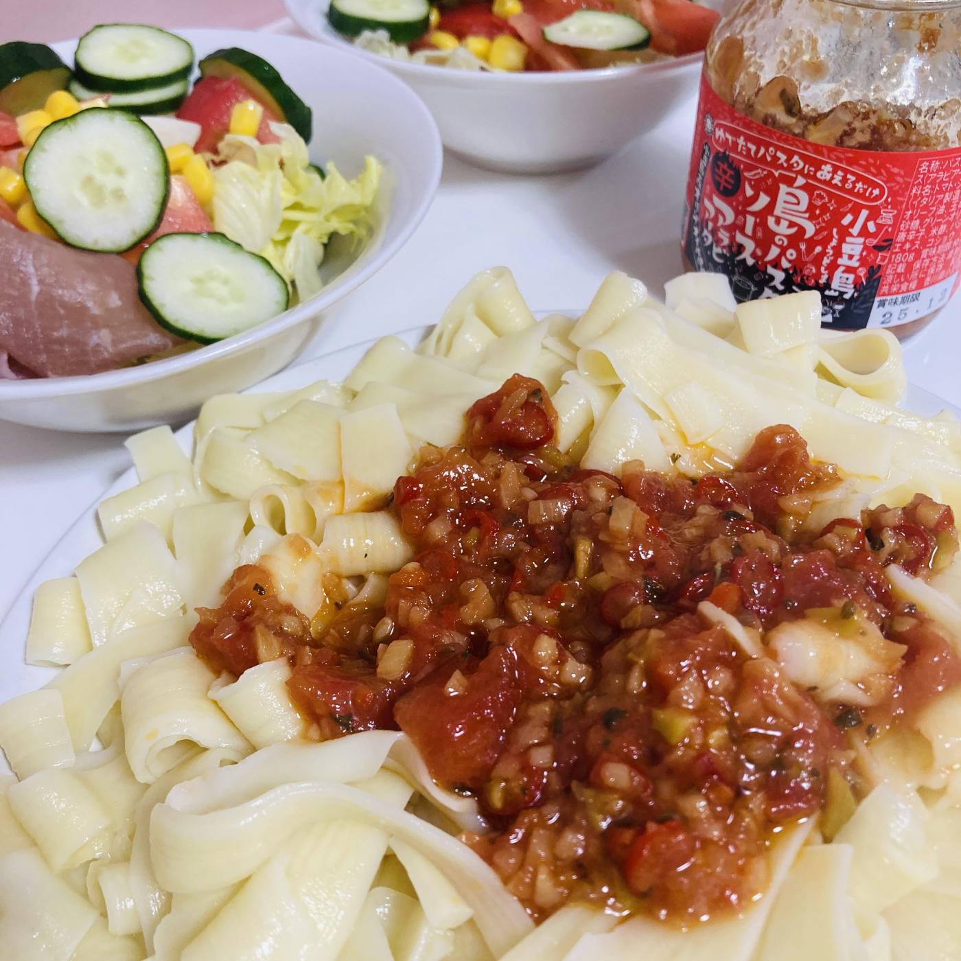 うーん、ソースちょっと少ないのかなと心配でしたがちょうどよくてすごく美味。からみもちょうどよくて、子供も一緒においしいねと食べられました。辛すぎないのは、みんなでワイワイ食べるときに大事ですよね。大容量過ぎず少なすぎずにパスタソースの量ちょうどいいですね。うれしいです。粉チーズかけて完成。これは食欲そそる夏にもおすすめのパスタです。