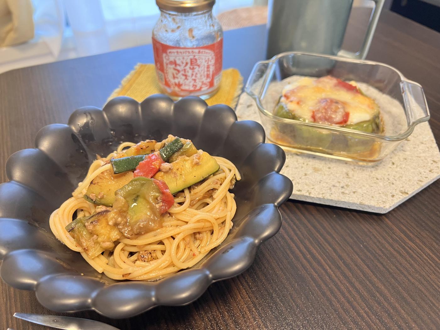 パスタは、ナス、ズッキーニ、ひき肉を炒めて、パスタと島のパスタソーストマトと和え、塩胡椒で味を整えただけで完成です。