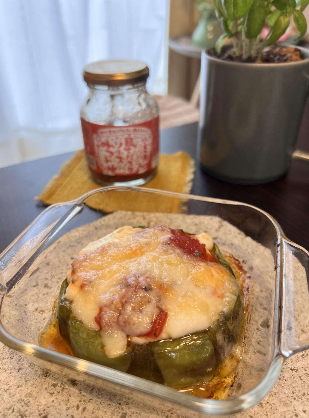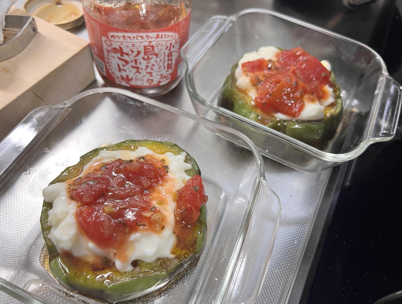 夏といえばナス。大きなナスを焼いて〜そのまま食べても美味しいですが、ここはグッと我慢して、耐熱皿に移す。上からホワイトソース、この島のパスタソーストマトをかけて、チーズを乗せて、オーブントースターへ。これでナスにおいしさ追加、簡単なのについでに見た目の豪華さもアップで、おかず一品完成でした。