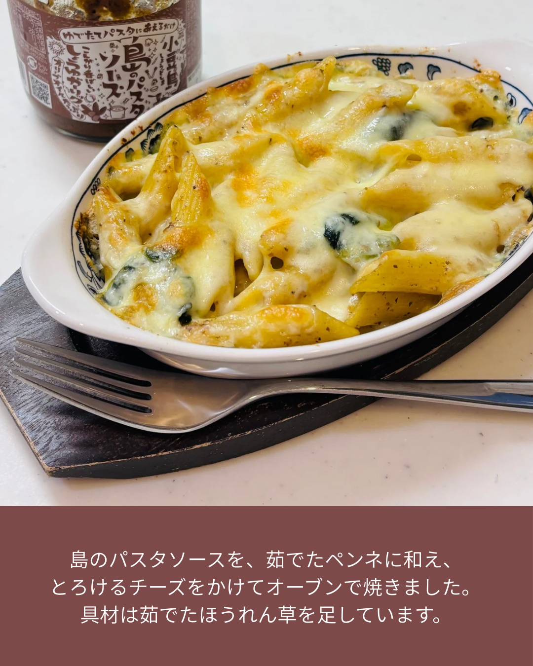 島のパスタソースを、茹でたペンネに和え、とろけるチーズをかけてオーブンで焼いてみました。