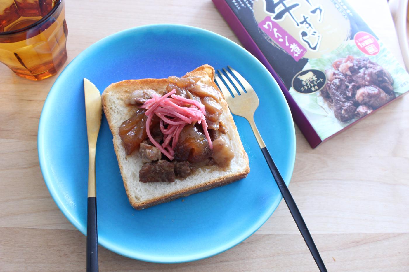 アレンジ方法として、ごはんにのせたら牛丼になると書かれていたので、パンにのせて牛丼トーストに🍞