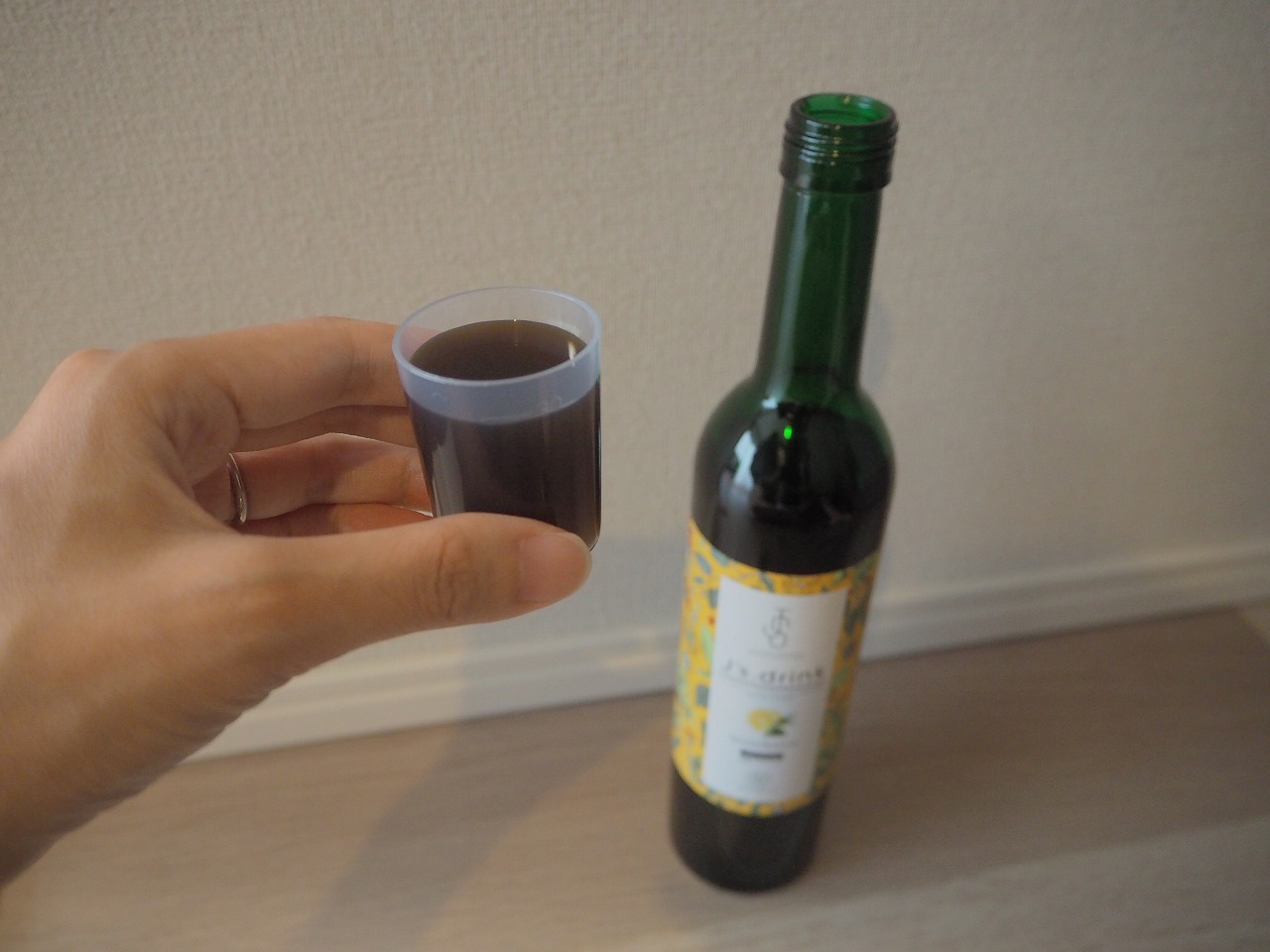 あとは、開封後なら早く飲んだ方が良いみたいなので、1日の目安量を守って毎日続けて飲むのが良いですね。さて、1日の目安量は30mlです。キャップではかれます。こんな量ならぐいっと飲めちゃいますよね。コップに入れるとこんな量です。少ないのがよくわかると思います。水で2倍に薄めてもこの量で済みます。味ですが…見た目がちょっときついので、どんな味かと思ったらレモン風味で思ったよりも飲みやすかったです!ただ、すっぱいのがあまり得意でない方やなるべくクセのない状態で飲みたいという方は水などで薄めるのがオススメ。私は水で2倍に薄め、そこに氷を2つほど入れて飲みましたが、これが自分のベストでした!炭酸水で割ってもおいしそうなので、試してみます。500mlで税抜き7800円とお高いです。自分用に買うのは結構勇気が…でも、プレゼントとかに喜ばれそう。女友達へのプレゼントに良いなーと思います。あとはホームパーティーに持って行っても良いかも!