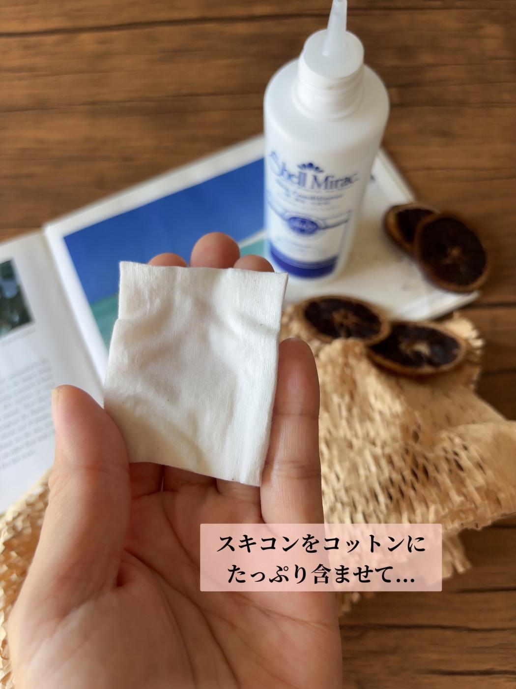 スキコンをコットンにたっぷり含ませて、優しくパッティングした後に拭き取るのがポイント☝️