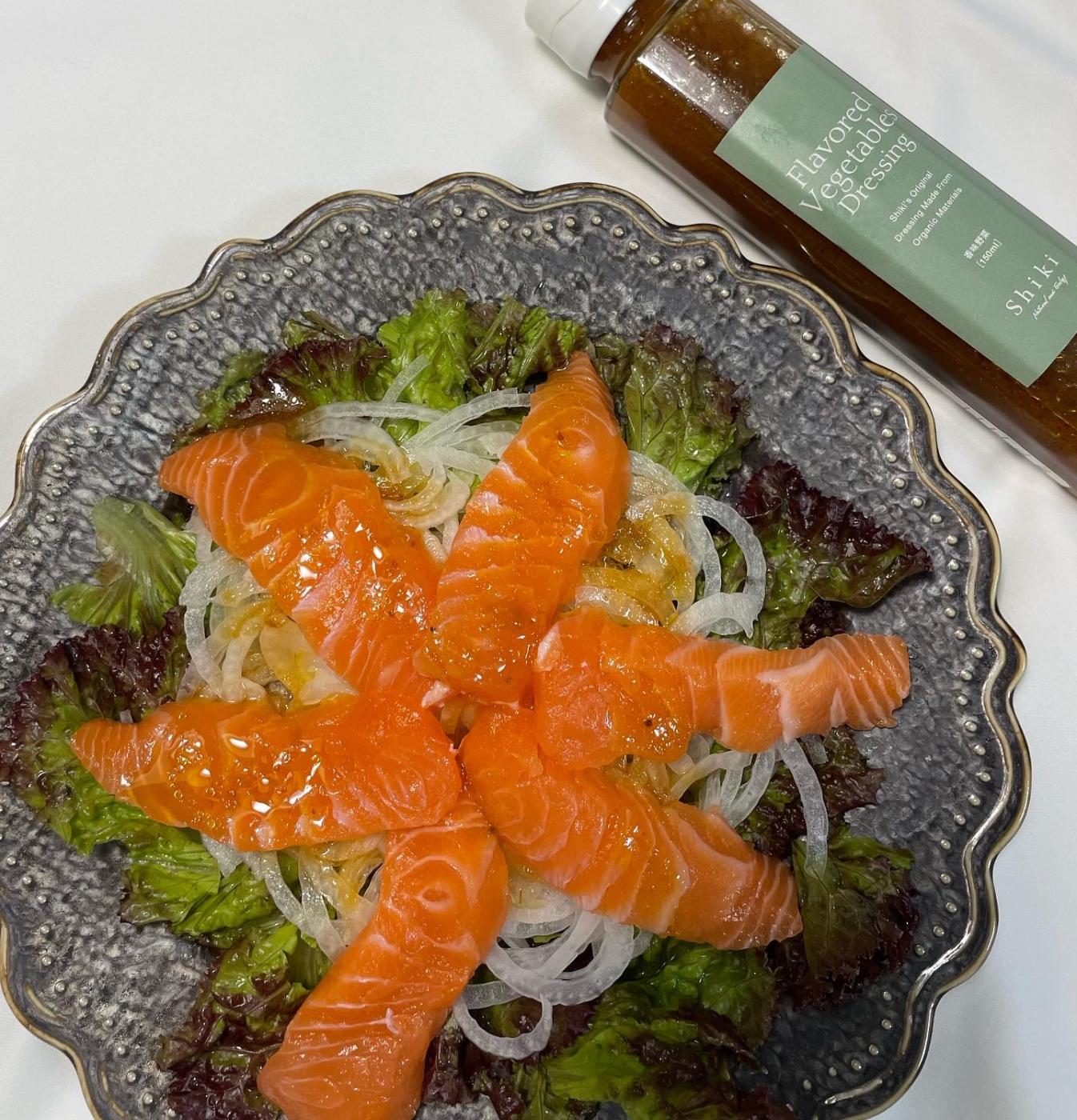 香味野菜はサーモンと新玉ねぎのサラダにかけてみましたが、和風な味がサーモンや玉ねぎとよく合います。