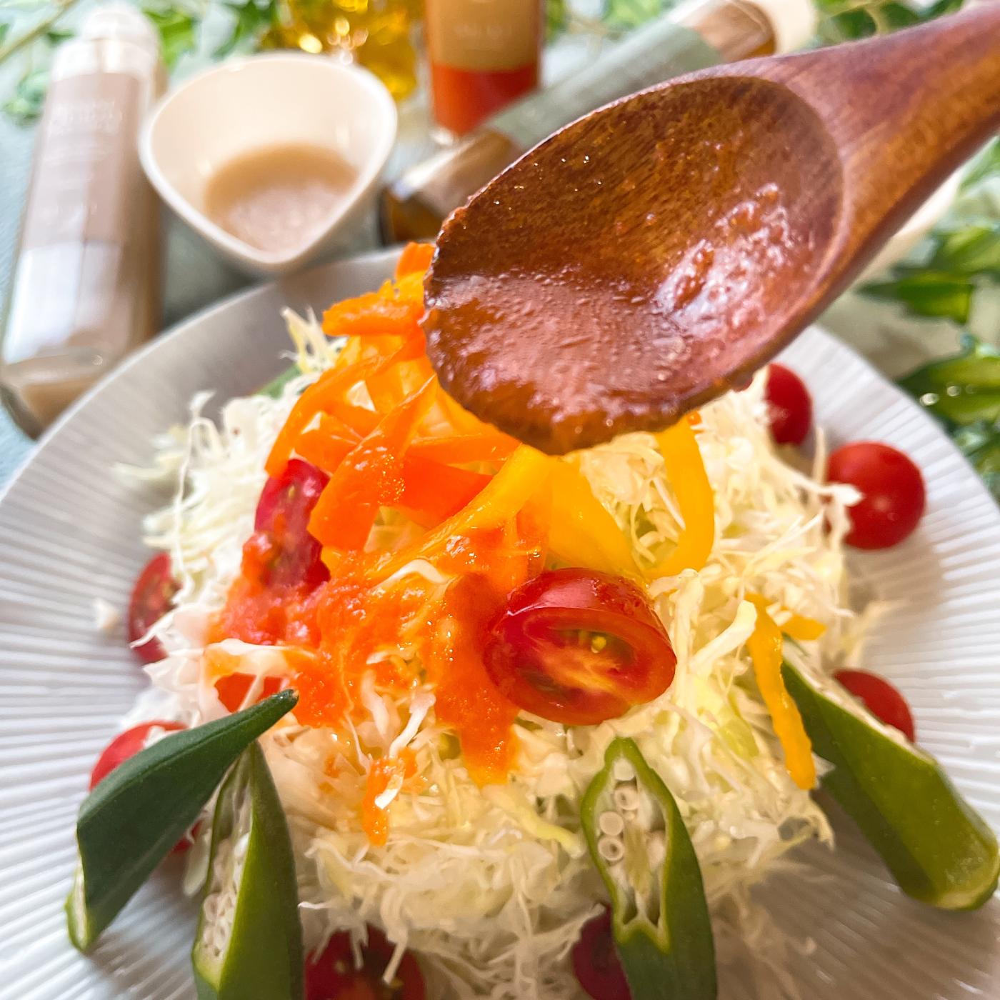 りんご酢にオリーブオイル、にんじん、玉ねぎ、赤パプリカなどを使いとてもなじみのある香りです和風サラダにぴったりなので、海藻サラダにもオススメらしいですよっ