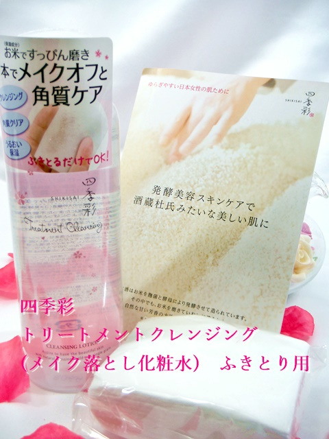 私は夜寝るのが遅いときがあり、洗面所を使うのが嫌になることがあります。するとこの四季彩トリートメントクレンジングが役立っています。それは、洗顔にもなりくすみをとるのにいいのとその後のスキンケアが入りやすい。メイクを落とすのに摩擦なくコットンに含ませたのを滑らせると一発で取れるという事です。お米の保湿成分配合ということから水で洗い流すことがないのもうれしいですね。発売元の井田両国堂様は、他にも合ったらいいなぁというプチプラコスメを多く発売されていて、この商品もウォータープルーフを使用しないメイクで使用するというのが共感持てました。それは落ちないのに落とすという拭き取りクレンジングが多いのが嫌でたまらないのでしたがこれは肌に優しいというのと信頼性と真実味がありよかったです。朝の洗顔の代わりにくすみがとれ、夜遅く寝るときのメイク落としとして役立ちました。付属のコットンも大きくて使い易いでした。主成分の大吟醸の角質を落とし透明美肌という着目とテクスチャーの質感もシンプルでよかったと思います。