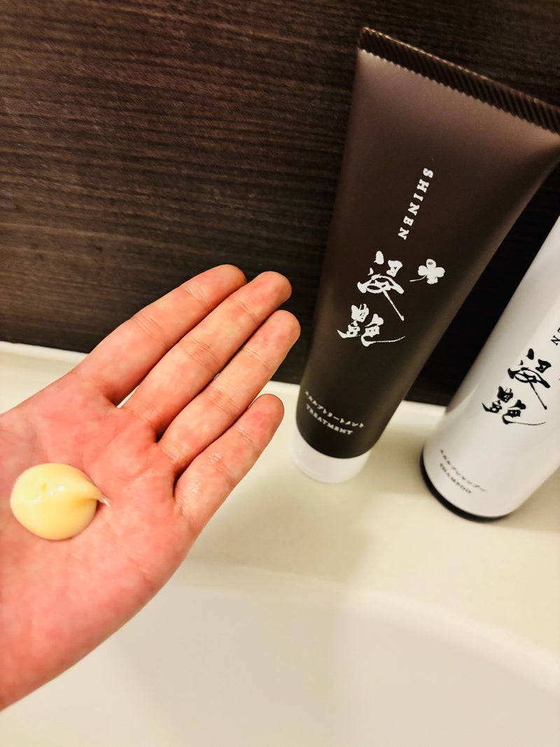 ビタミンC誘導体・NMNなどの有効成分を配合されているということで、べたつき感のない使い心地です。トリートメントなのにさらっとしている感じ。