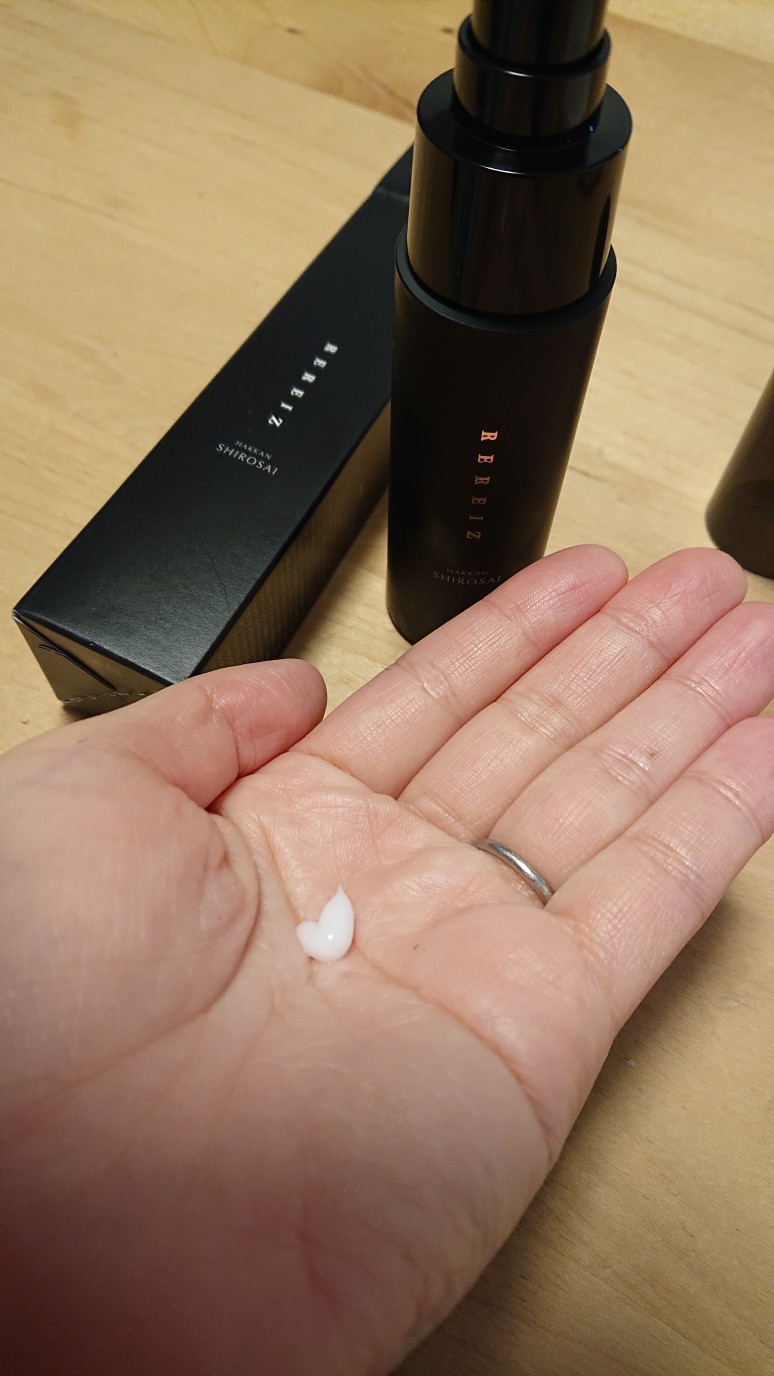 こちらは、ポンプ式になっています。白い柔らかいクリームが出て来ました。気になるほうれい線や顔にしっかり塗りました。すごくのびがよくて、お肌がすごく潤いました。最近、顔の感じがひどくてクリームを塗ってから、ファンデーションを塗っているんですが、すぐにカサカサになってしまいます。