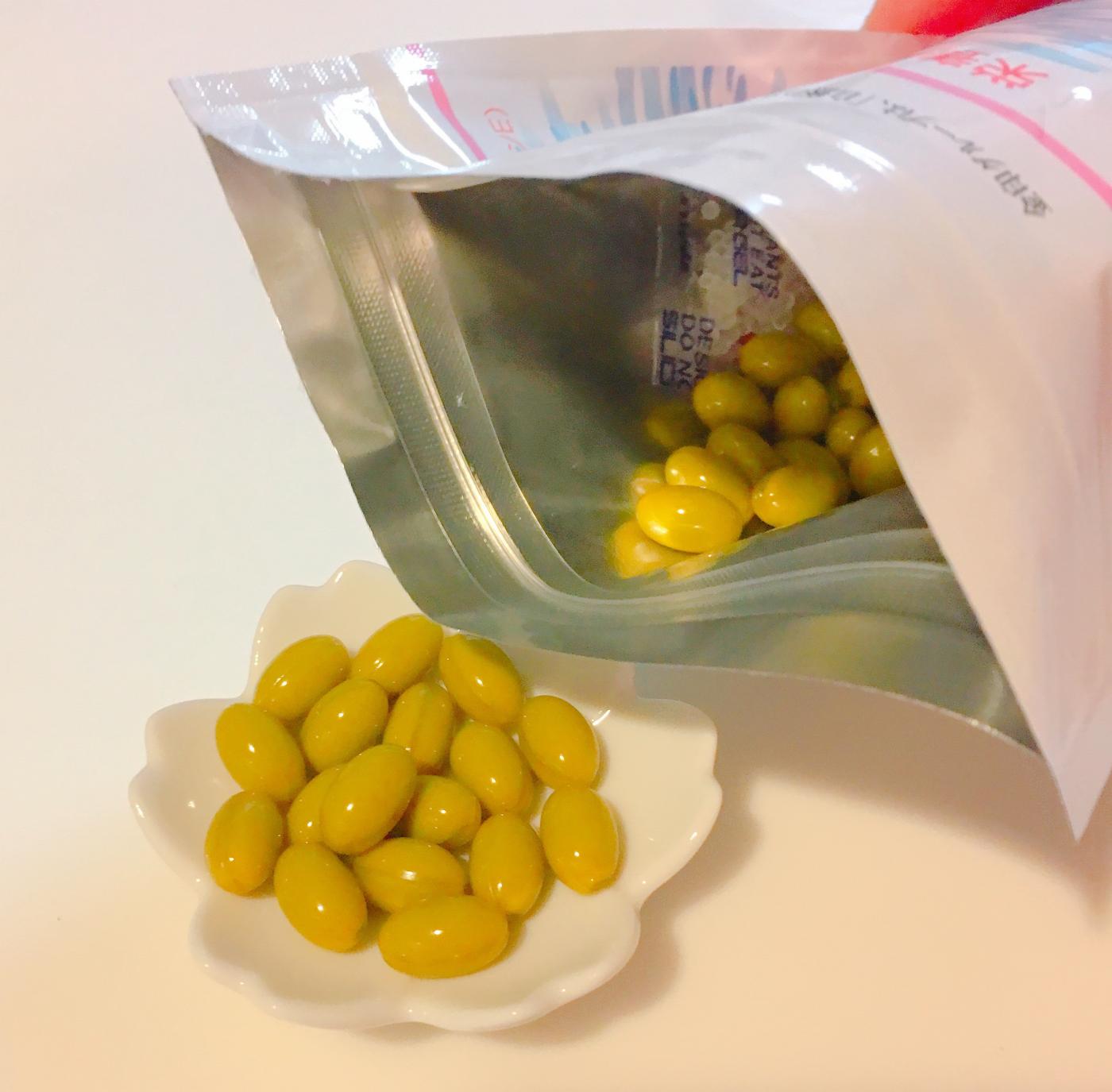 手にとってみると、つるんとした枝豆のような色のカプセルタイプのサプリ。水と一緒に飲むと、喉にひっかかるようなことはなくスルリと飲めます。この色がワサビの成分なのかな?