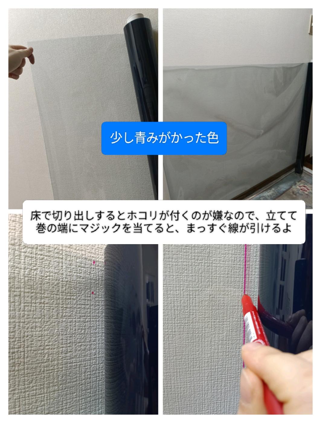 長細い箱でたっぷりの巻で届きます。1人で運べる重さ。幅は90cm程。シートの色は少し暗めの青みがかった色で、目立ちません。まず貼りたいところの窓のサイズを測ります。私は70cm×105cmでしたので切る必要がありました。カッターの方がまっすぐ切れると思いますが、簡単に済ませたかったのでハサミで。今回我が家の極寒の地、北側の部屋の北向きの窓に設置しました。すりガラスなので、ちゃんと貼り付いてくれるか不安でしたが、今のところ問題なし。サイズもきっちりに切り出すよりも、少しだけ小さめの方が剥がれるきっかけがなくなりいいと思います。シートがしっかりしていて、少し剥がれると自重でべろーんとなり始めることもあるので。専用のヘラはついてないので、手持ちのものでサッサと空気を逃して作業時間はやり直しや切り出し、サイズ調整を入れても30分。切り出ししてしまえば、とても手軽。視界も悪くならないですし、良さそう。部屋の極寒度合いもやや緩和されている気もします。