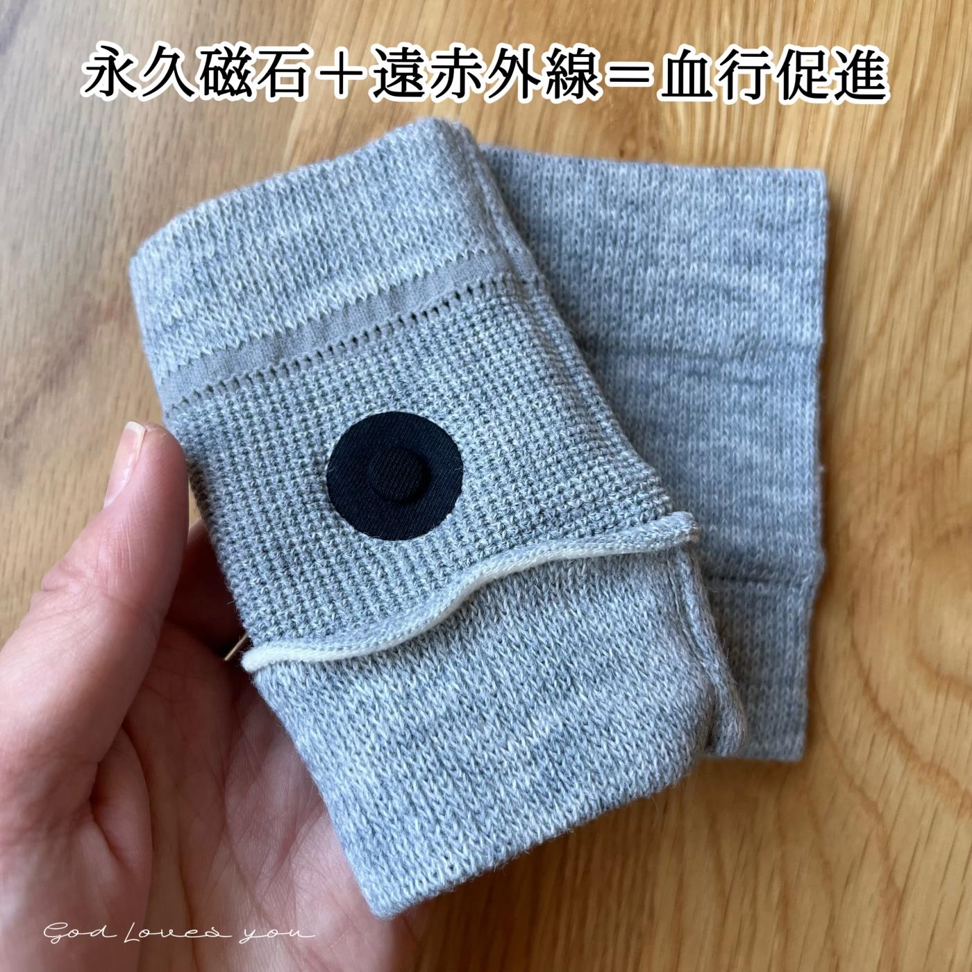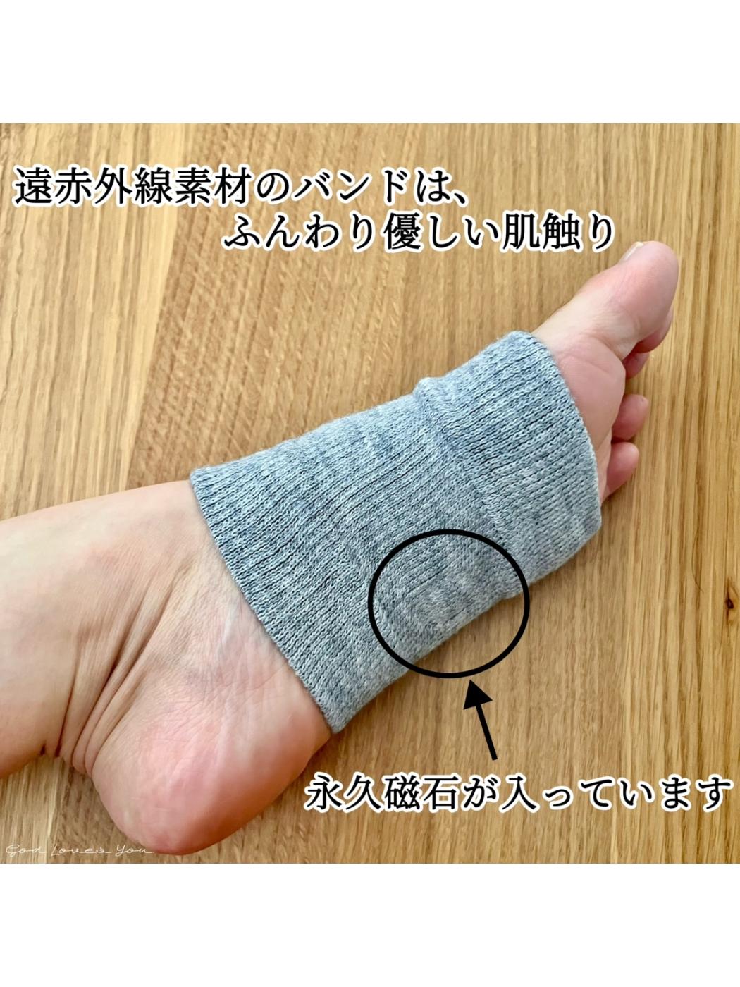 遠赤外線素材のバンドに強力磁石が取り付けられた、履くだけで足裏がぽかぽかになる足用バンド。左右兼用・男女兼用・手洗いOK。下肢の冷えや夜間のツリ予防ができる。