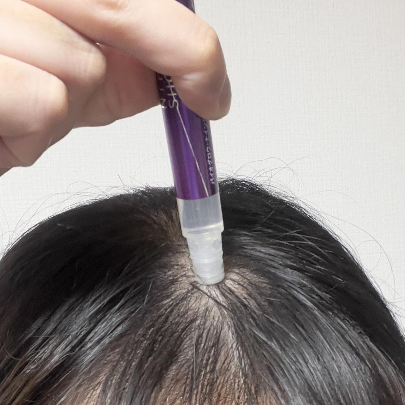 使い方は簡単で、頭皮を垂直にあて、ノック式ボタンを1回プッシュして、ノック式ボタンから指を離し、頭皮に当てたまま3秒キープして、頭皮に残った美容液を優しく揉むように馴染ませたらOKです!
