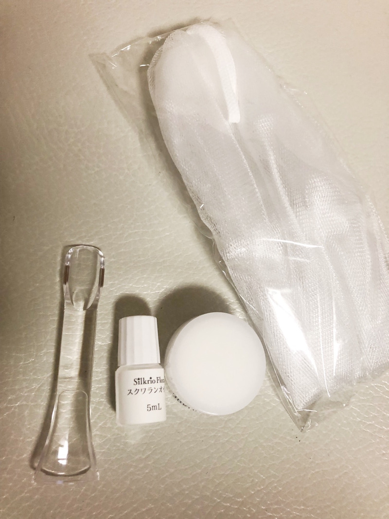 シルクリオ フローラ 洗顔用お試しセットには、シルクリオ フローラ 4g・泡立てネット・スパチュラ・スクワランオイル 5mL(天然オイル100%)が入っています。