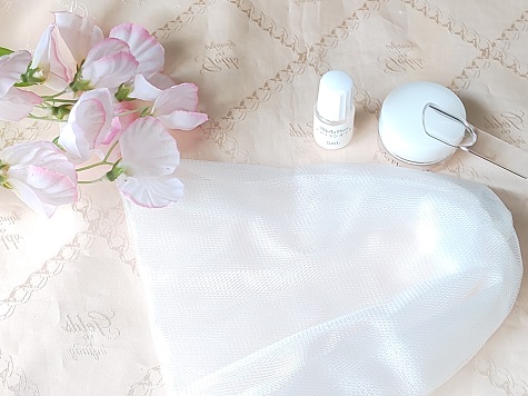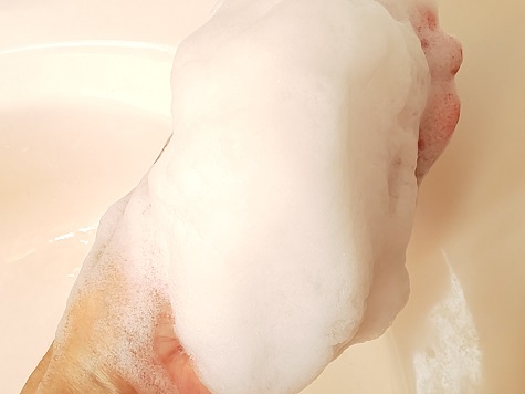 泡立てネットにたっぷりの水を含ませ、石鹸をのせて、揉むようにして泡立てます。