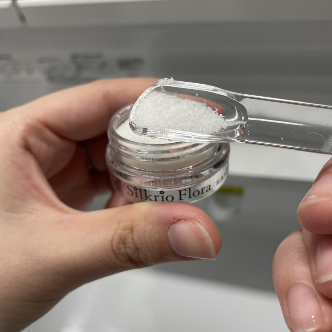 まず、中を開けるとシルクリオフローラと泡立てネット、スクワランオイル、スパチュラが入っていました。最初、スクワランオイルが洗顔料だと思ったのですが、粉末の方が石鹸で驚き👀粉石鹸は泡たつのか?保湿力があるのかと色々疑問に思いましたけど、早速使ってみました✨