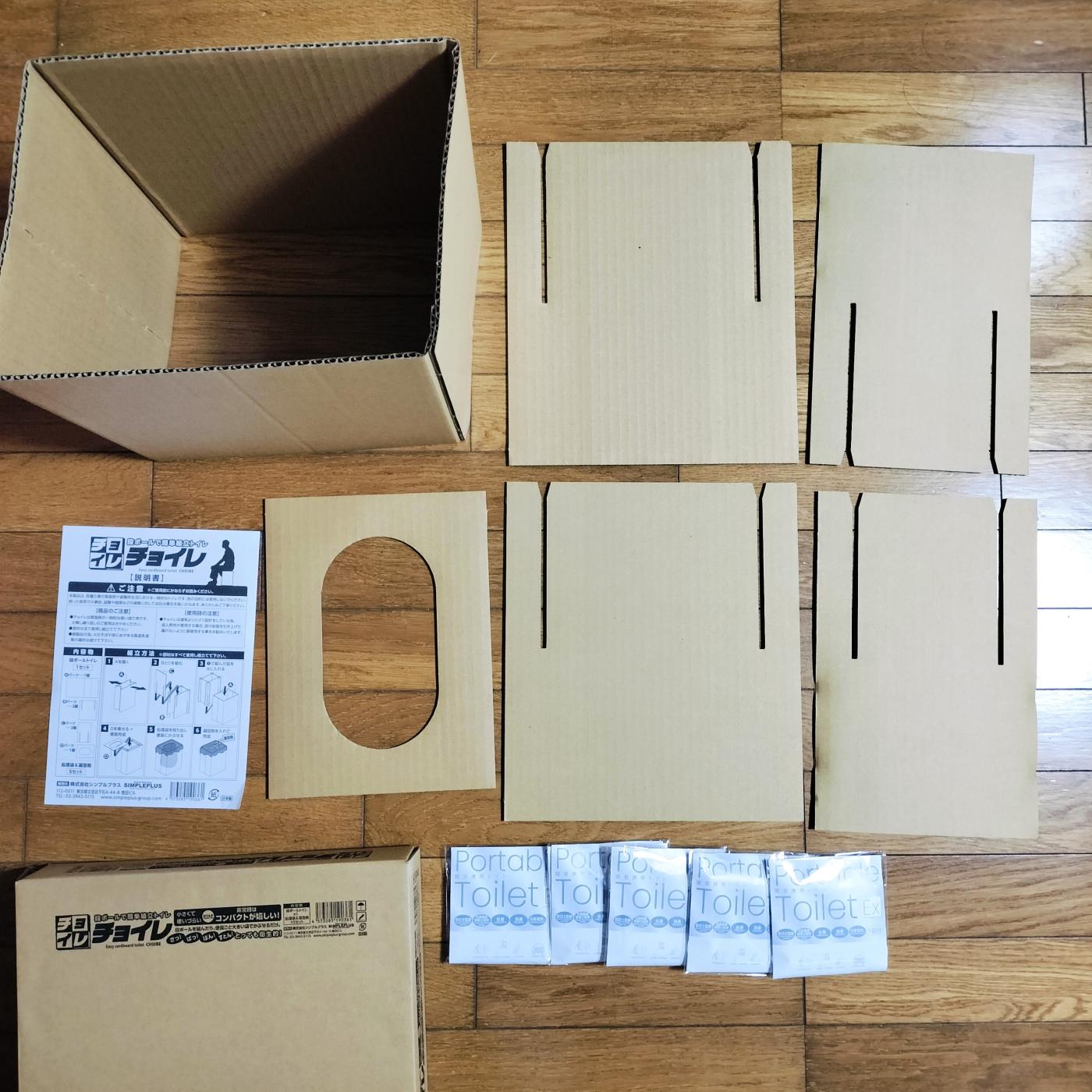 「チョイレ」のレビューです。 段ボールで組み立てる簡易トイレです。 ボックに入っていますよ。 中...