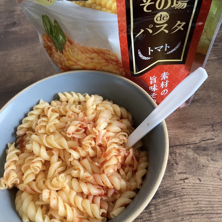 「その場deパスタ トマト」 お湯を注いで3分! 簡単にトマトパスタの出来上がり! 時間のない...