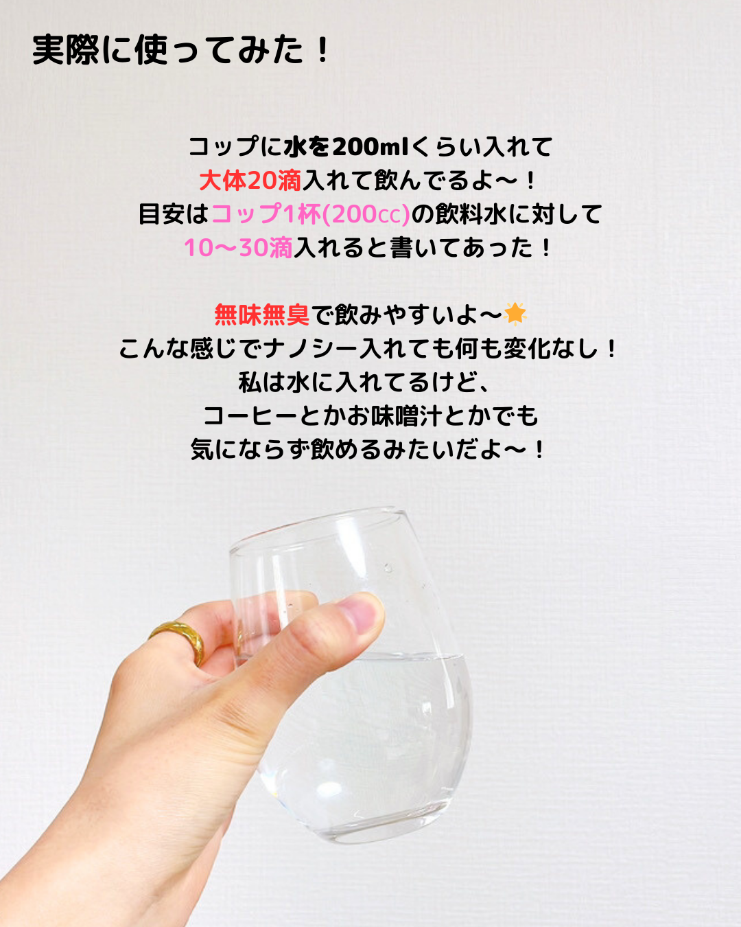 目安はコップ1杯(200㏄)の飲料水に対して10~30滴入れると書いてあった!