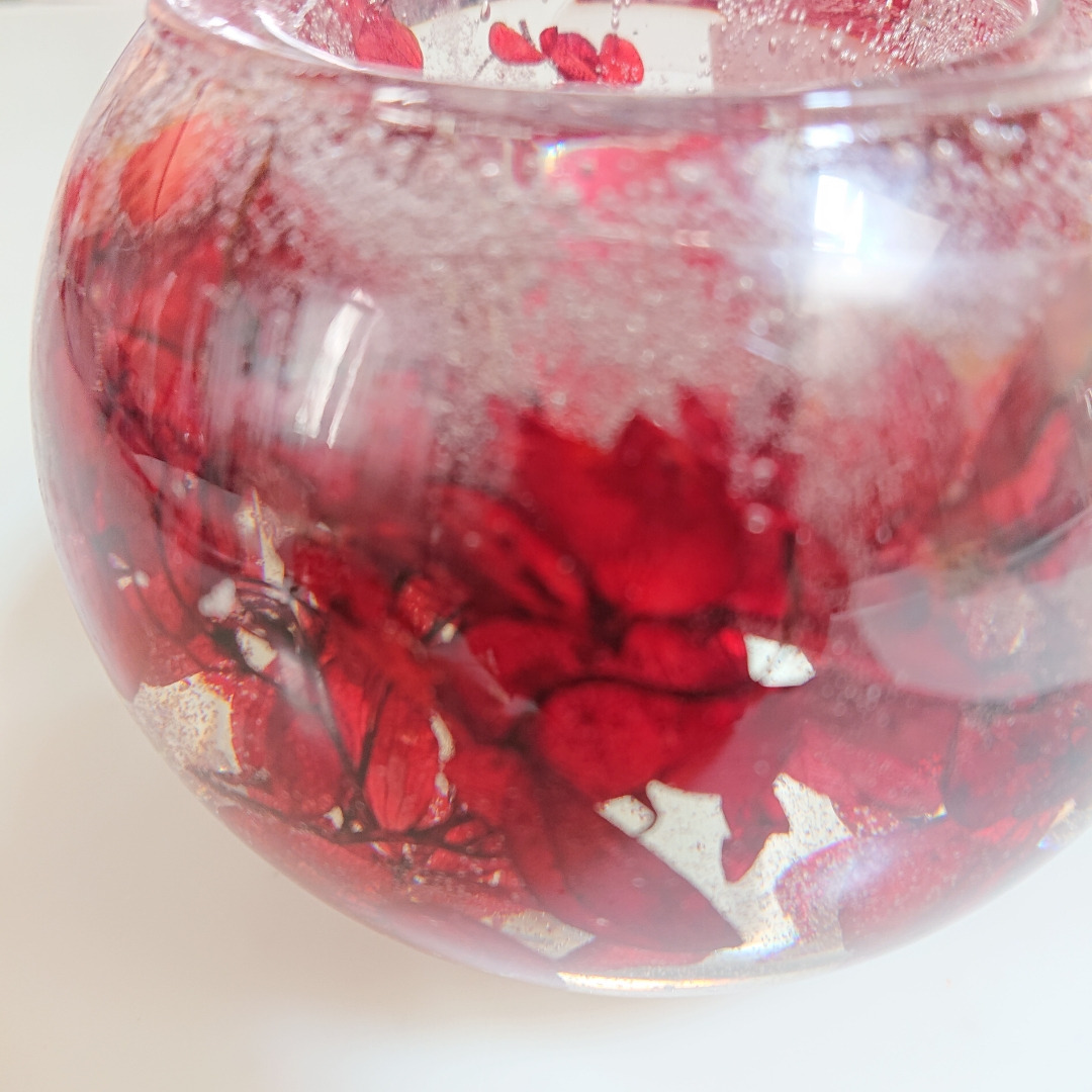 可愛くラッピングされたものから取り出してみると、赤いお花を使ったハーバリウムを閉じ込めたキャンドルホルダーが出てきました。