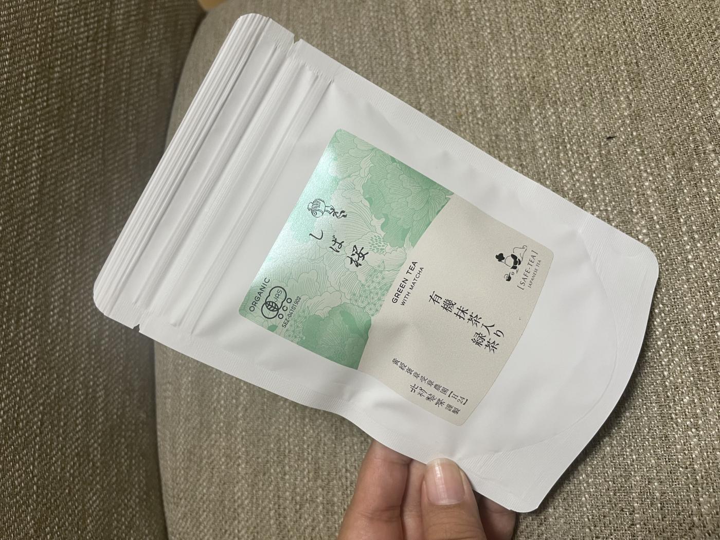 今回いただいたのは、有機抹茶入りの緑茶「しば桜」です。