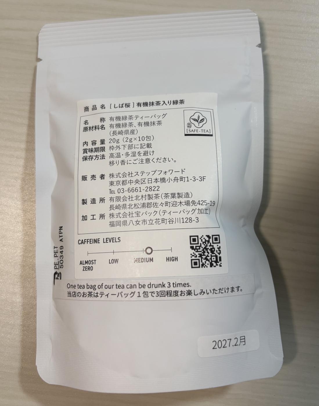コエタスのモニターキャンペーンでもらった「SAFE-TEA(セーフティー) しば桜(有機抹茶入り緑茶) パウチ...