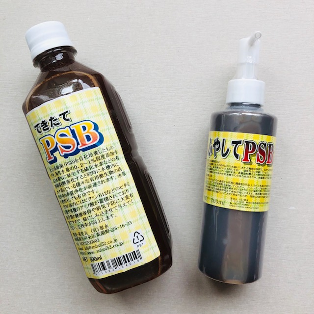 「できたてPSB 500ml」は、ペットボトル入りで、光合成細菌を培養するための餌の「ふやしてPSB 200ml...