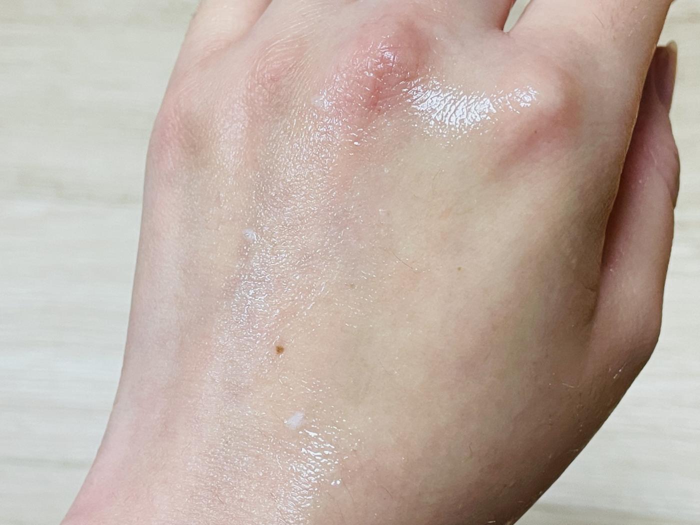 30秒ほど置いて顔を触ると少しぬるっとした感触に変わり、白く濁った水になりました。