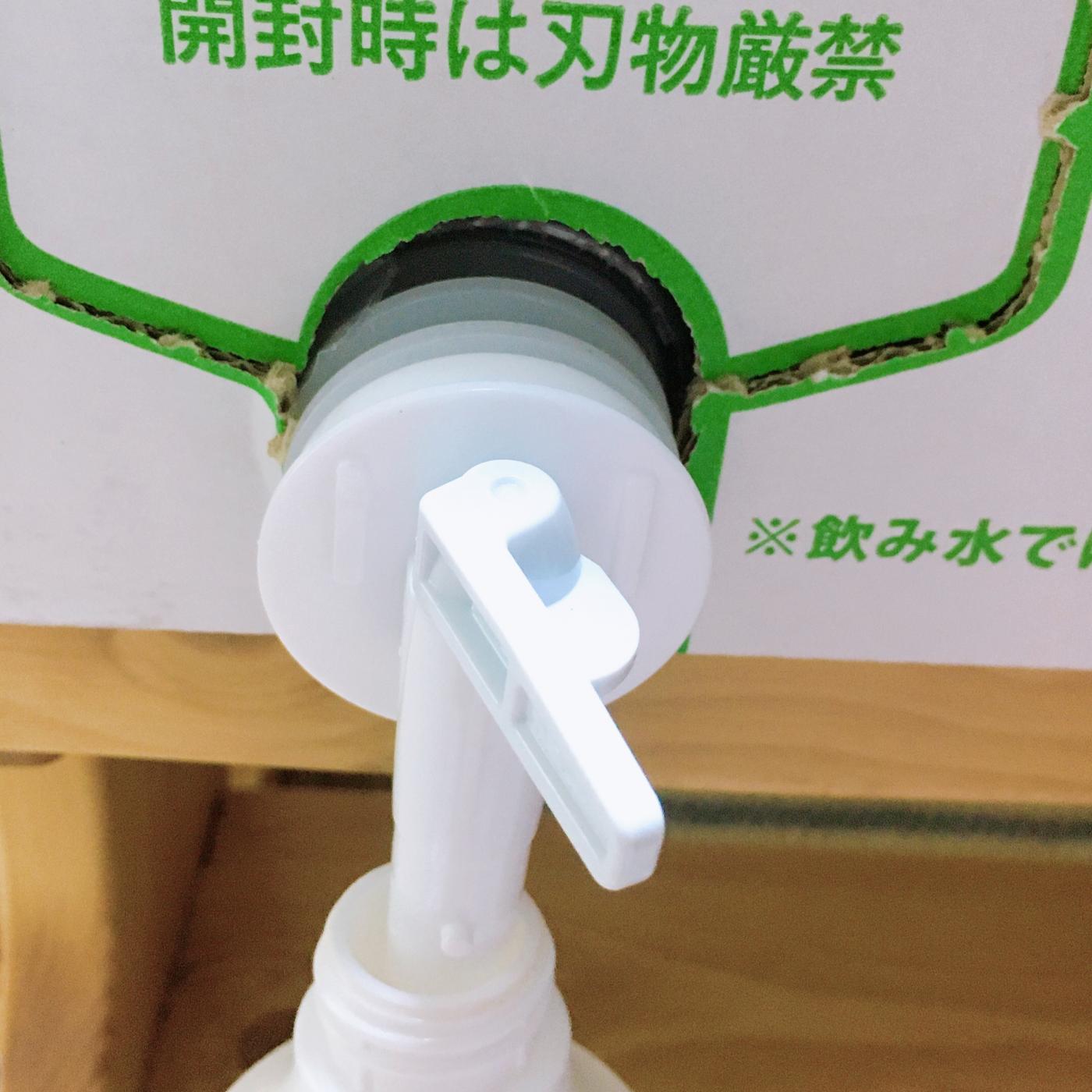 専用の段ボール箱にビニール袋が入っていて、その中に次亜塩素酸水が入っている形です。しっかりした専用コックがついているので、そこで開け閉めを行えます。早速スプレー容器に入れて使っています。