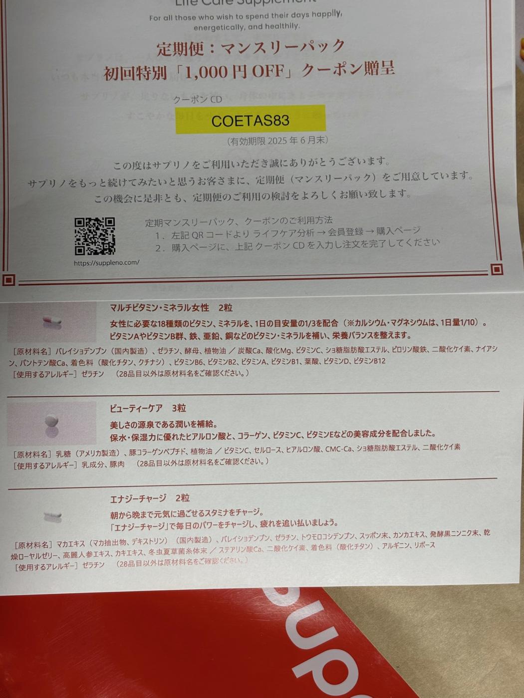 コエタスのモニターキャンペーンでいただきました株式会社Suppleno Suppleno(サプリノ)についてのレビュ...