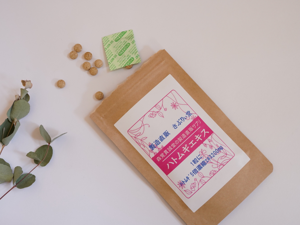 さぷりぃ堂のハトムギエキス錠は、5倍濃縮エキス200mg含有。
