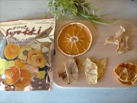 薄くスライスした、リンゴ、愛媛の清美オレンジ、静岡みかん、パイナップル、バナナを油で揚げず、独自の「素焼き製法」で乾燥させた優しい甘さと程よい酸味のフルーツスナックです。