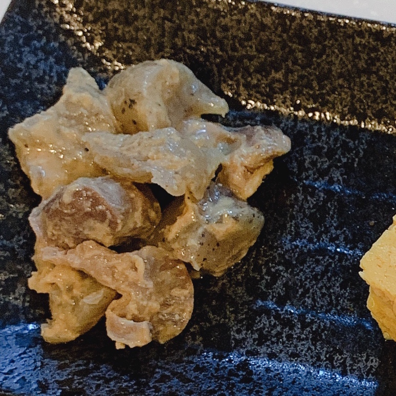 砂肝こんにゃくの酢みそ和えは砂肝のコリコリした食感とこんにゃくのフワフワ感が楽しめます。生姜がきいていて、砂肝好きのよくお酒を飲む主人に好評でした。