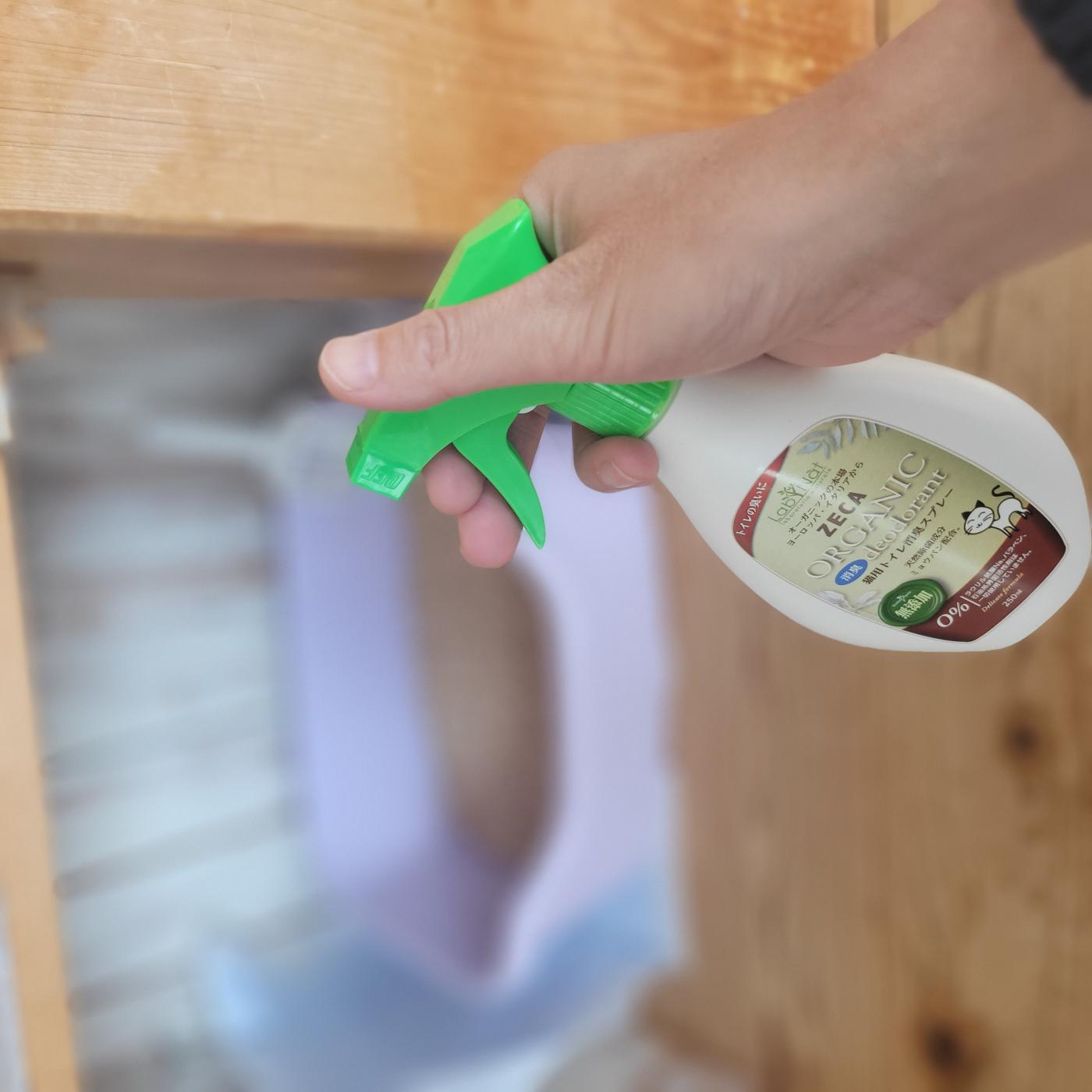 スプレーノズルをON(sprayかstream)に回して、ペットシーツやトイレに直接吹きかけるだけ