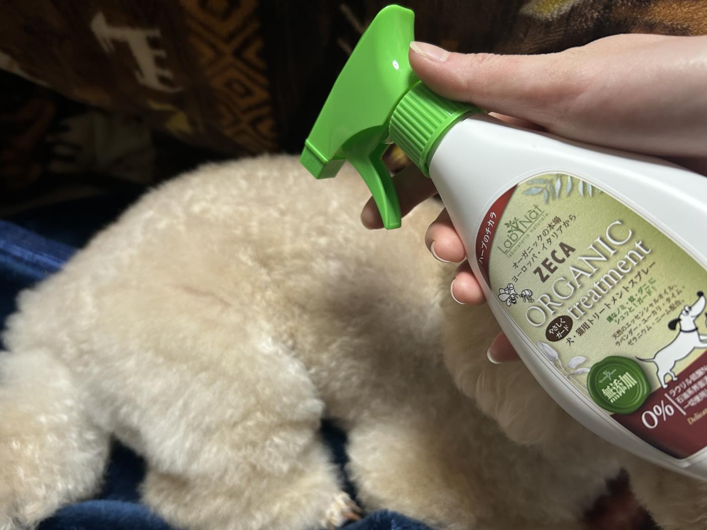 そのまま吹きかけると愛犬が嫌がって逃げて行くので私の手にスプレーしてからそれを愛犬に塗り塗りしています。